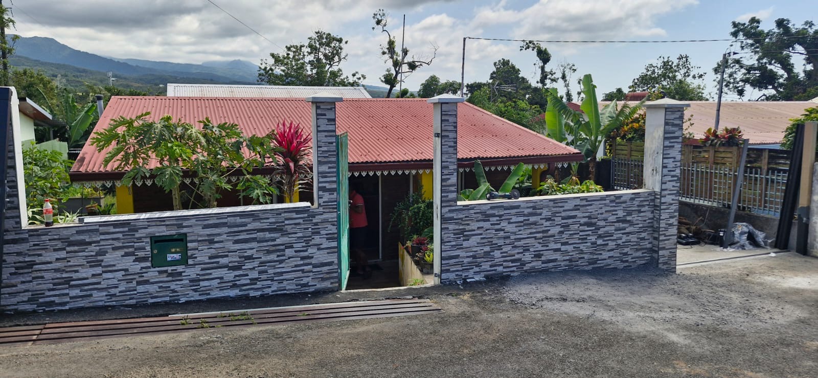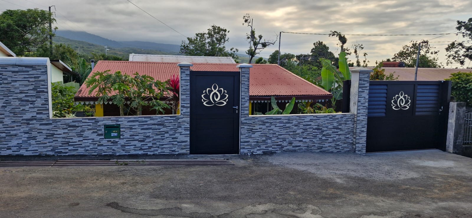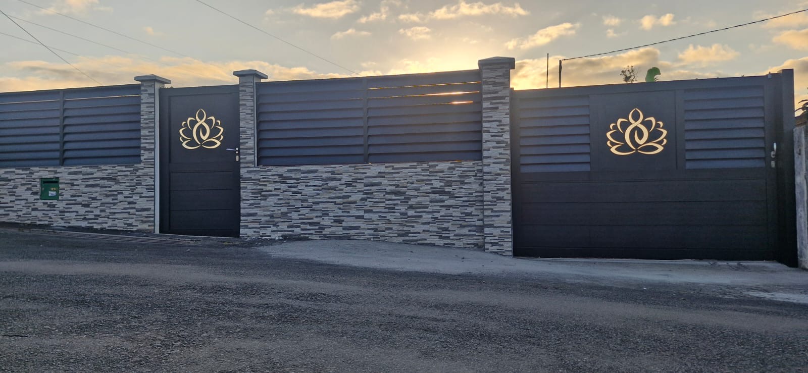 Portail coulissant bas plein avec partie haute persienne et panneau décoratif
